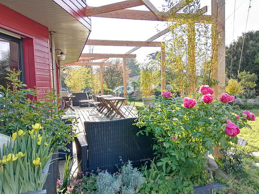 A l'extérieur de la maison, vous pourrez profiter de 2 terrasses plein sud - une donnant directement sur le jardin aménagé et son terrain de boules, et l'autre à l'étage, dominant la propriété avec vue sur une multitude d'arbres, bosquets et fleurs de notre jardin suivant les saisons.